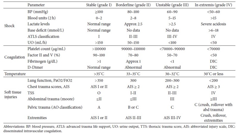 The key for management involves expedient and efficient resuscitation immediately following injury. Managing blood loss, coagulopathy and temperature is paramount at the initial stage. There are several parameters which may be used to identify patients which would be suitable for early stabilisation. By employing the Injury Severity Score (ISS) and Abbreviated Injury Score (AIS), it is suggested that patients be divided into 4 groups (stable, borderline, unstable and in extremis). Early total care is considered for those patients in the former 2 categories and it is recommended that surgical time be kept under 2 hours [6]. These categories are summarised in Table 1 by Nicola R (2013) Early Total Care versus Damage Control: Current Concepts in the Orthopedic Care of Polytrauma Patients. ISRN Orthop. 2013:329452 [5]: