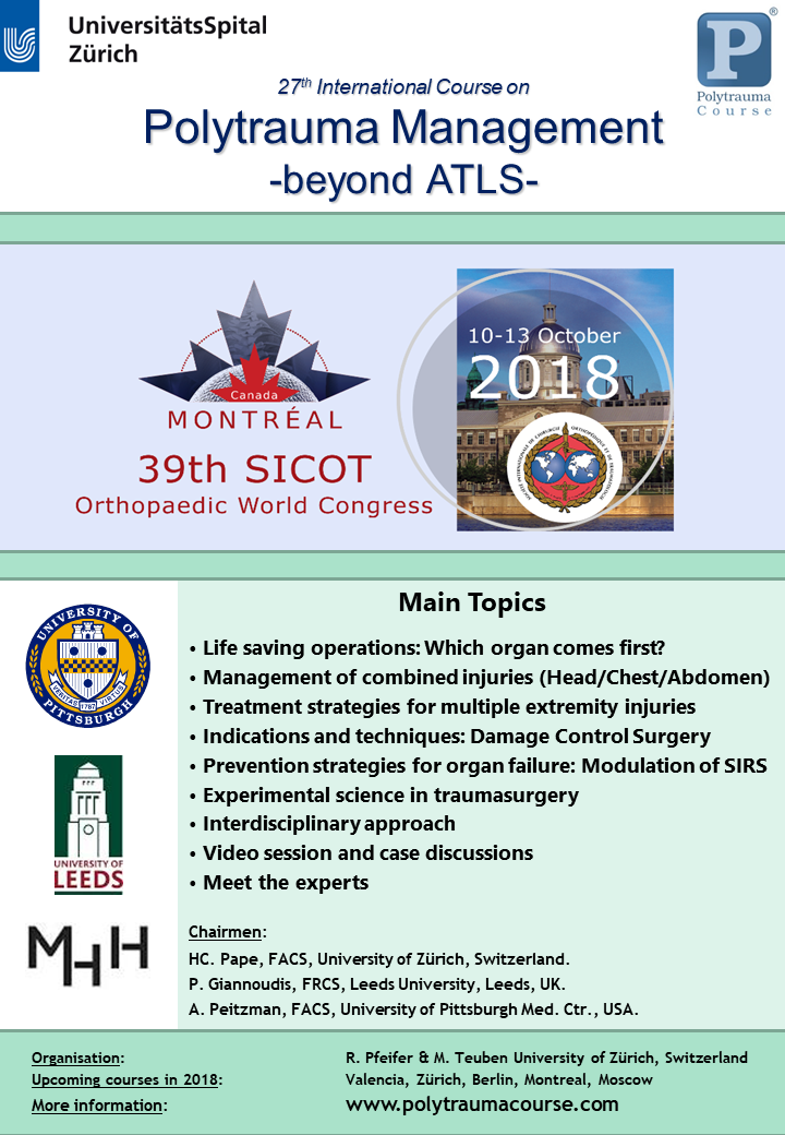 Date | Wednesday, 10 October 2018 Participants must register and pay the registration fee for the 39th SICOT Orthopaedic World Congress to be able to register for the 27th International Course on Polytrauma Management. Registration is now open! Click here to register |