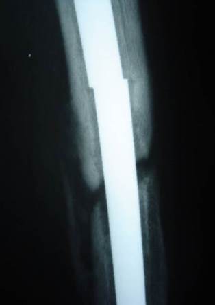 • Distal part of the nail was removed by a hole distally in the lateral cortex then pushed by a drill pit and pulled through the medulla by an intestinal clamp.