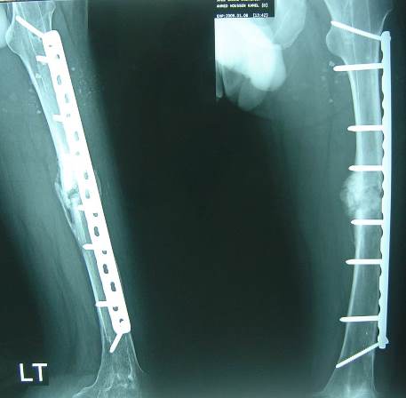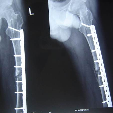 • Operative time: 4 hours nail removal + 2 hours plate insertion.